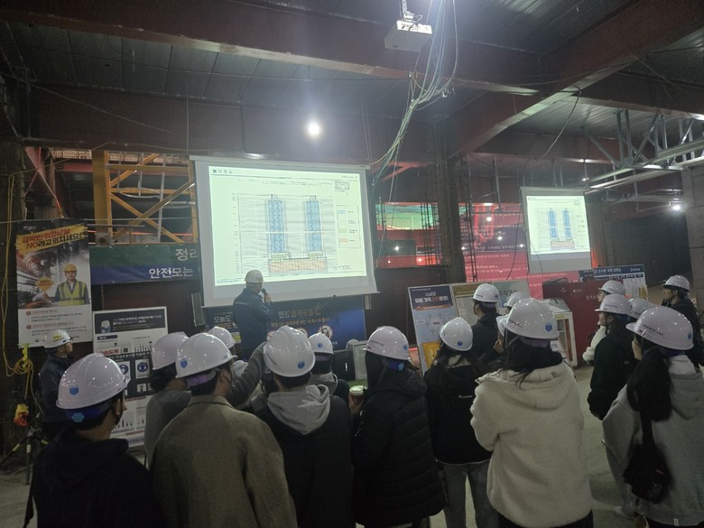 2부 현장 견학에서는 학생들이 관내 대형 오피스텔 신축 공사 현장을 방문해 사업 개요와 주요 시공 공법을 살펴보며, 학교에서 배운 이론이 실제 건축 현장에서 어떻게 구현되는지 직접 체험했다.