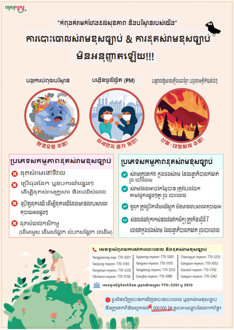 이에 군은 선제적으로 다수 외국인이 입국하는 캄보디아 계절근로자를 대상으로 다국어(크메르어)로 제작한 무단투기 방지 안내문과 쓰레기 분리배출 안내문을 배포하고, 집중 교육을 실시해 분리배출 정보에 대한 접근성을 높였다.