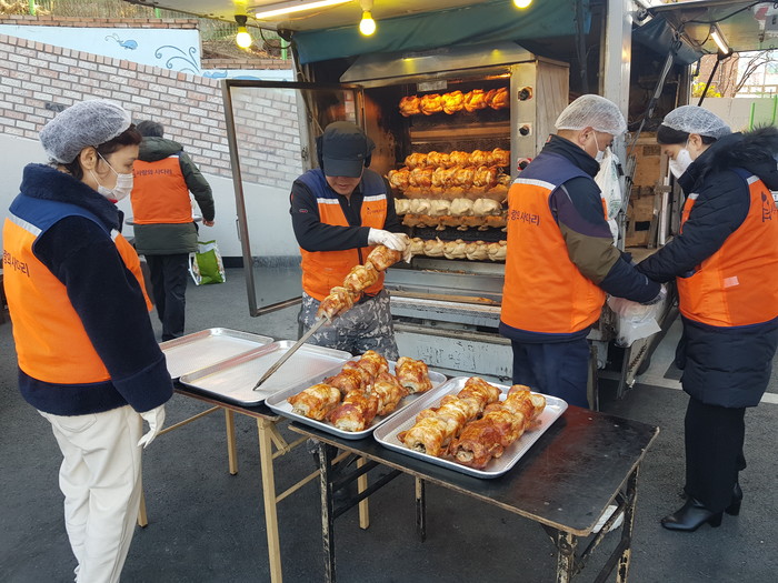 이날 봉사에는 신상일 단장을 비롯해서 김영애 박원홍 유희자 이봉만 봉사자들이 약 4시간 동안 바비큐 통닭을 직접 구어서 전달을 하였다.