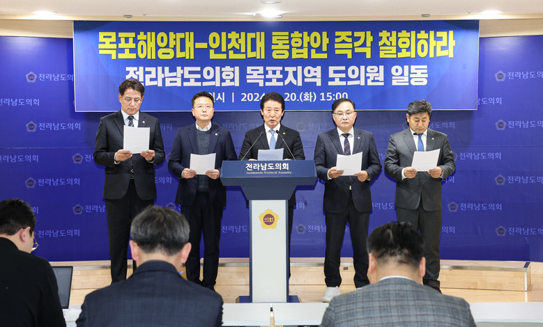 성명서를 대표로 발표한 전남도의회 전경선(더불어민주당, 목포5) 부의장은 “인구 감소와 지방소멸의 위기 상황에서 지방대학들이 생존을 위한 전략을 모색 중이며 목포해양대가 정책공모를 위한 공론의 장을 마련한 점은 높이 평가할 점이나, 지역과 상생 발전할 수 있는 목포대와의 통합안이 아닌 인천대와의 통합을 결정한 것은 잘못된 판단이다”고 지적했다.