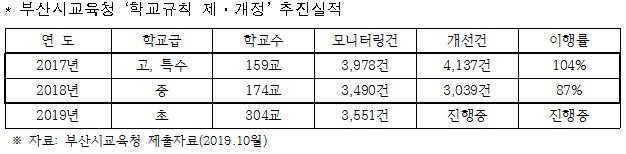 부산시교육청 제출자료에 따르면 ‘인권친화적 학교규칙’ 운영을 위해 2017년, 2018년 2년간 중.고등학교를 대상으로 학교규칙 제.개정 사업을 추진했고, 그 결과 7천 건이 넘는 개선을 이끌어낸 것으로 되어 있지만 동료학생을 신고하는 문제에 대해서는 지적이 미흡했던 것으로 보인다.