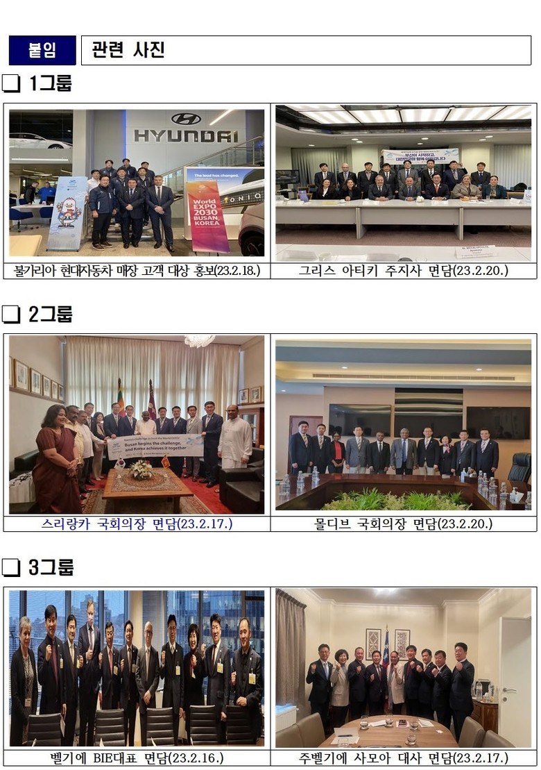 2030부산세계박람회 부산 유치지지 호소 [부산 세계타임즈=이용우 기자] 부산광역시의회는 작년에 이어 올해 2030부산세계박람회 유치지지를 호소하기 위해 의원24명을 3개그룹으로 나누어 BIE 회원국에 대한 현지 홍보활동을 전개하였다. 각 그룹별로 10여일간의 현지 홍보활동을 펼쳤으며, 빠듯한 일정을 모두 소화한 3개그룹은 2월 25일 모든 일정을 마치고 차례로 귀국하였다.