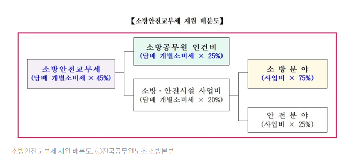 소방안전교부세는 열악한 소방현장의 업무환경 개선을 위해 2015년에 도입된 것으로서 재원은 담배 개별소비세(지방세) 총액의 45%로 충당되며 이 중 25%는 소방인력 인건비로 우선 사용하도록 하고 나머지 20%는 소방분야와 안전분야에 배정하되 소방분야에 75% 이상이 반드시 투입되도록 특례 규정이 적용되고 있다.