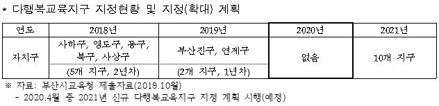 부산시교육청은 지난 7월 보도자료를 통해 ‘2020년 신규 다행복교육지구 지정’ 계획을 추진한다고 밝힌 바 있으나 최근 제출자료에서 내년 신규지정 지역이 없다고 밝혔다.