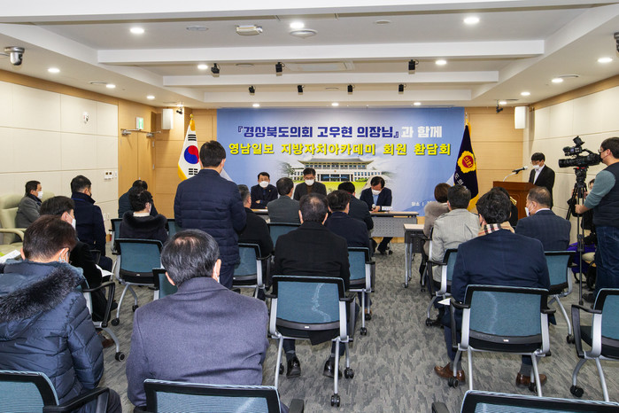 [경북=세계타임즈 한성국 기자] 고우현 경상북도의회 의장은 1월 13일(목) 경상북도의회 세미나실에서 대구경북 정치 지망생인 영남일보 제2기 지방자치아카데미 회원 30여명과 도기욱 부의장, 안희영 운영위원장 등이 참석한 가운데 도의원 16년의 정치생활 Know-How를 후배 정치 지망생에게 아낌없이 전수하는 환담회를 개최했다.