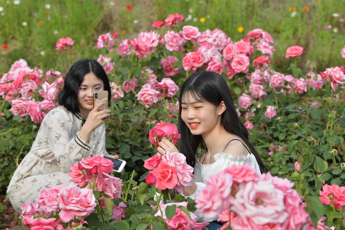 ☞ 25일(토) 서울장미축제를 함께 찾은 친구들이 중랑천 둔치에 조성된 분홍장미꽃밭에서 사진을 찍으며 즐거워하고 있다.