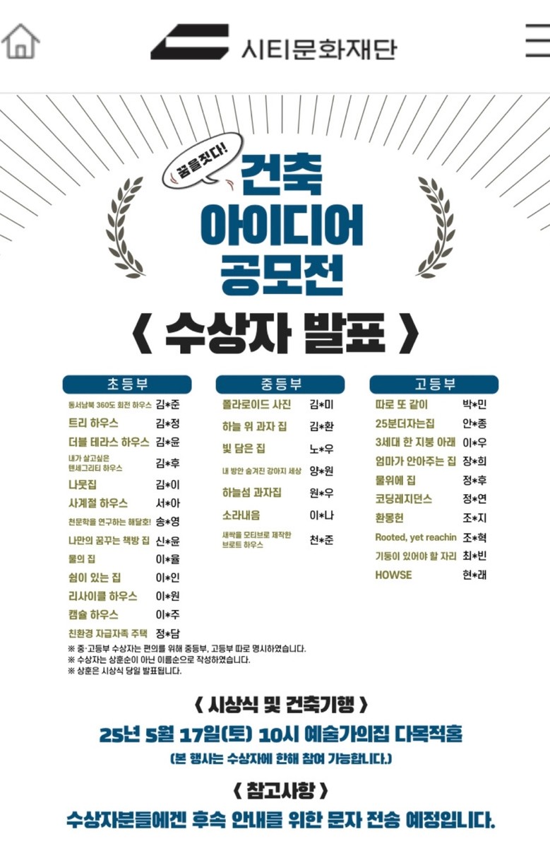 공모전 시상식은 오는 5월 17일(토), 서울 예술가의집 다목적홀에서 개최될 예정이며, 이 자리에서 대상·최우수상 수상작 발표와 함께 건축기획 발표회 및 메타버스 전시회가 진행될 계획이다.