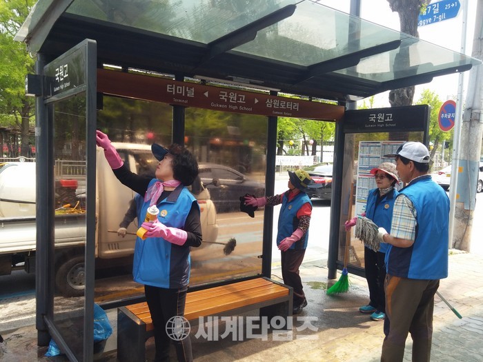 [충주=세계타임즈 이현진 기자] 충주시 봉방동 바르게살기위원회(위원장 정은택)가 시민들에게 깨끗하고 쾌적한 환경을 제공하기 위해 27일 버스승강장 대청소를 실시했다.