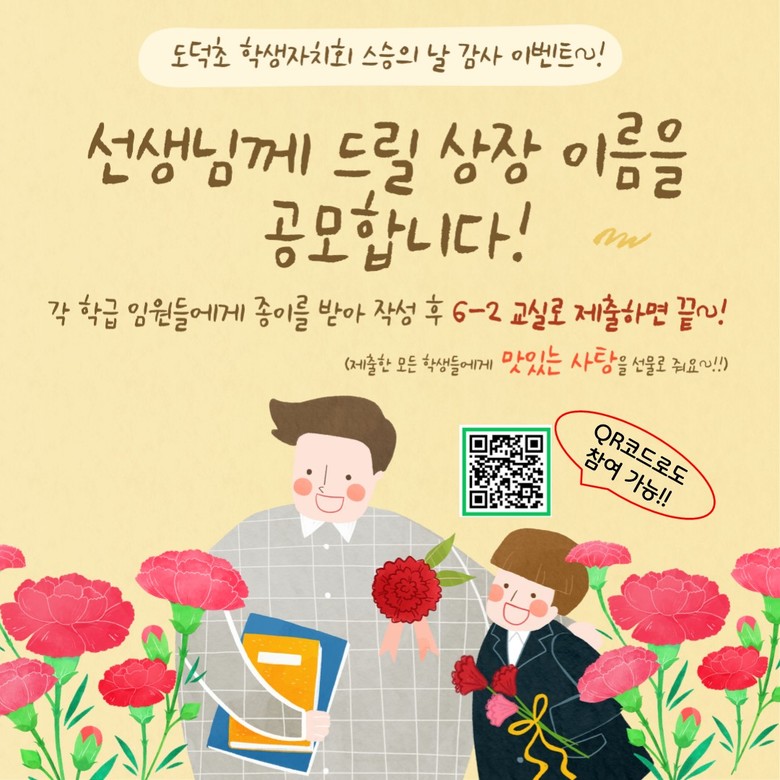 [광명시 세계타임즈=송민수 기자] 2023년 재개교한 도덕초등학교에서는 매년 스승의날에 특별한 이벤트가 펼쳐진다. 고생하시는 선생님들께 감사의 마음을 담아 개성 넘치는 상장을 만들어 수여하는 것이다. 도덕초 학생자치회에서는 올해에도 스승의날 한 달 전부터 전교생을 대상으로 선생님께 드릴 상장 이름을 공모하였다. 거의 모든 학생들이 참여한 이벤트를 통해 재치있는 상장이 만들어졌다.