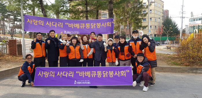 [대전=세계타임즈 이장성 기자] 7천명 SNS 대전광역시 봉사단체 사랑의 사다리 밴드(리더 이정제)는 29일 오전11시, 대덕구 목상동 다사랑아파트 경로당에서 (주)동건운수(대표 이선엽)와 함께 바베큐통닭 120마리 봉사로 사회적 효행을 실천하였다.