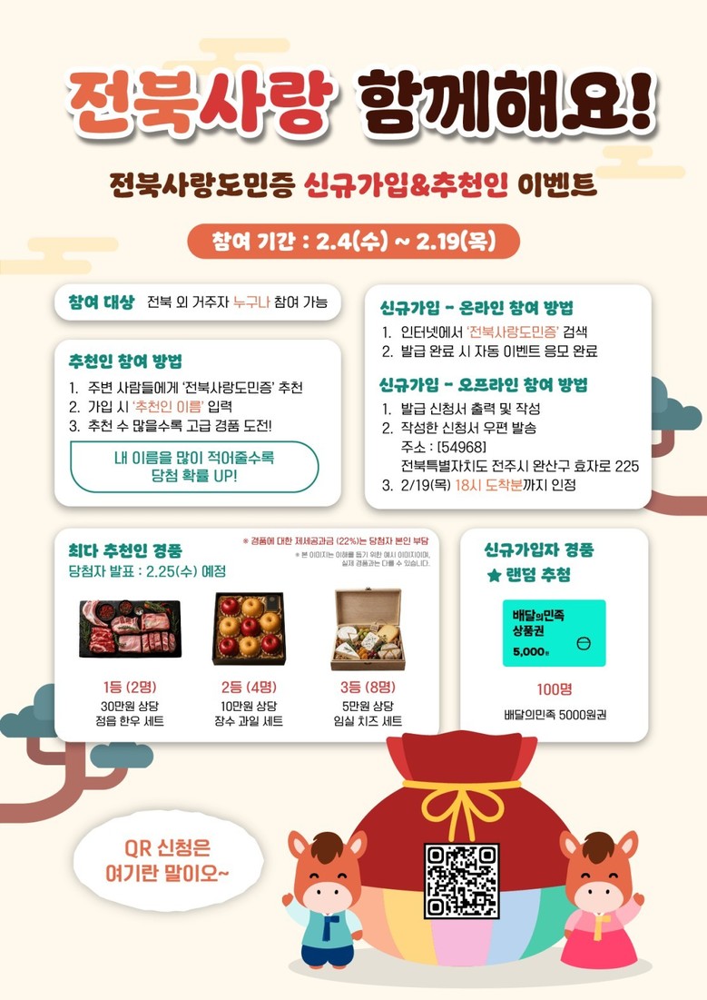 도는 설 명절을 계기로 고향 방문객을 대상으로 집중 홍보를 펼치고, 2월 4일부터 19일까지 ‘전북사랑도민증 가입 및 추천인 이벤트’를 추진해 자발적인 참여 분위기를 확산할 계획이다. 또한 전국적 네트워크를 보유한 기업과 상생발전 협약 지역을 대상으로 맞춤형 홍보를 병행해 가입 외연을 넓혀 나간다는 방침이다.