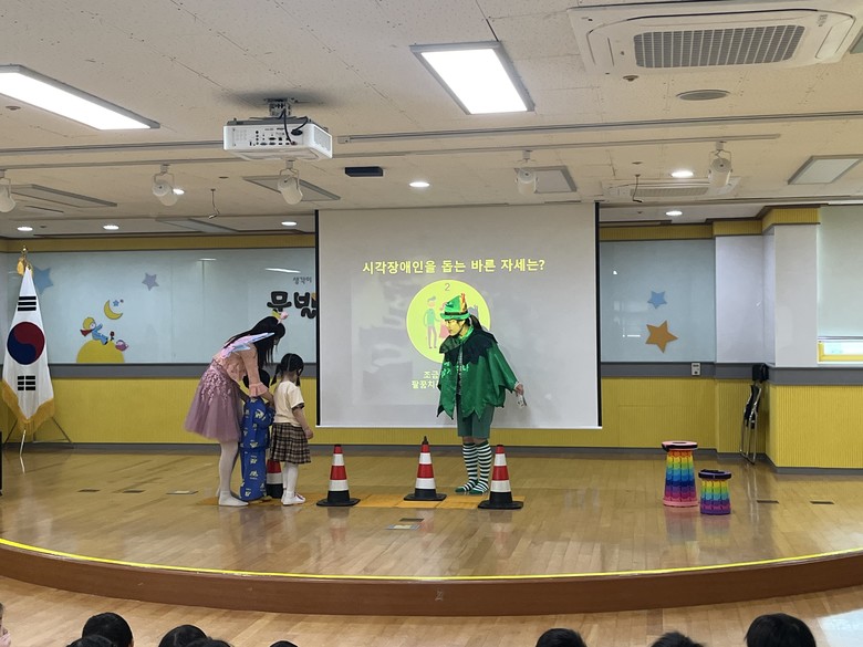 공연 후반에는 유아들이 직접 참여하는 퀴즈와 체험 활동이 마련되었다. 시각장애와 청각장애에 대한 퀴즈를 통해 앞서 배운 내용을 되짚어 보았고,‘우린 다르지만 서로 사랑해’라는 수어 노래를 배우며 청각장애인과의 소통 방식을 경험해보는 뜻깊은 시간도 가졌다.