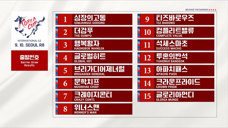 서울 8경주(출발시각 16시 30분)로 열리는 코리아컵의 출발번호는 1심장의고동, 2더검푸, 3행복왕자, 4글로벌히트, 5브리가디어제너럴, 6문학치프, 7크레이지콘티, 8위너스맨, 9티즈바로우즈, 10컴플리트밸류, 11석세스마초, 12투혼의반석, 13아파치패스(홍콩), 14크라운프라이드(일본), 15글로리아먼디(일본) 순이다.