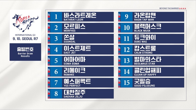 10일 일요일 서울7경주(출발시각 15시 25분)로 펼쳐지는 코리아스프린트의 출발번호는 1바스라트레온(일본), 2모르피스, 3쏜살, 4이스트제트, 5어마어마, 6리메이크(일본), 7예스퍼펙트, 8대한질주, 9라온탑맨, 10블랙머스크, 11듀크와이(홍콩), 12캄스트롱, 13벌마의스타, 14클린업해피, 15굿필승 으로 결정됐다.