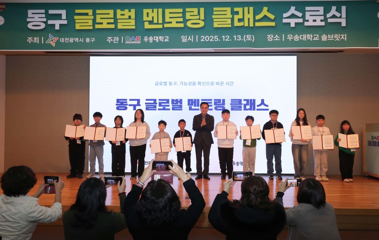 이번 수료식은 2025년 대전광역시 인구감소 및 저출산 대응 공모사업으로 추진된 ‘동구 글로벌 멘토링 클래스’ 사업의 성공적인 마무리를 기념하고, 참여자들의 노고를 격려하기 위해 마련됐다.