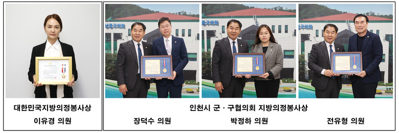 인천시군구의장협의회에 수여하는 지방의정봉사상는 지역사회의 모범이 되고 주민을 위한 활발한 의정활동으로 지역사회 및 지방자치발전에 기여한 지방의원에게 주는 상으로 장덕수, 박정하, 전유형 의원이 수상하였다.