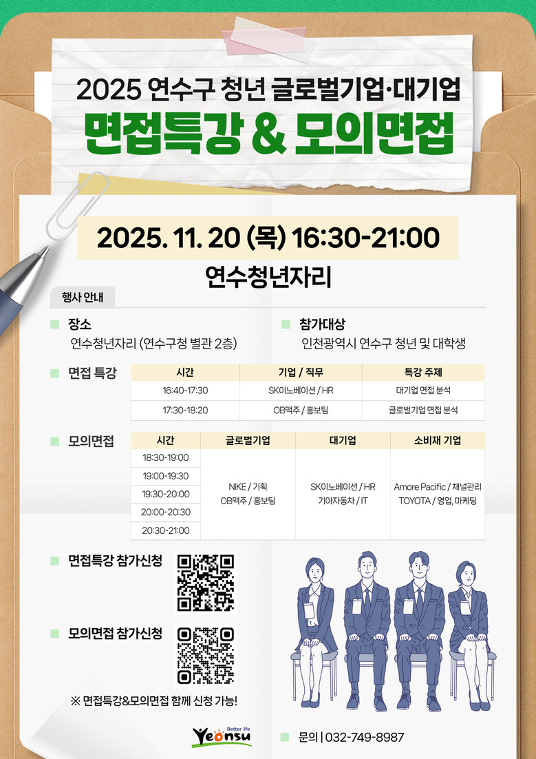 참여 신청은 연수청년자리 누리집을 통해 할 수 있으며, 자세한 사항은 연수구 일자리정책과(☎032-749-7833)로 문의하면 된다.