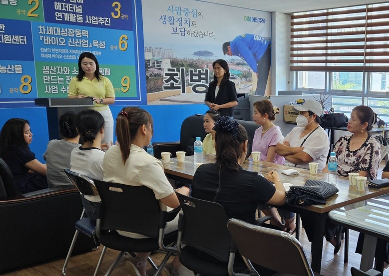 [전남 세계타임즈=우덕현 기자] 전라남도의회 보건복지환경위원회 최병용(더불어민주당, 여수5) 위원장은 지난 7월 6일 결혼이주여성과 함께 외국인 계절근로자 제도 개선과 범죄예방을 위한 간담회를 갖고 해법 찾기에 나섰다.