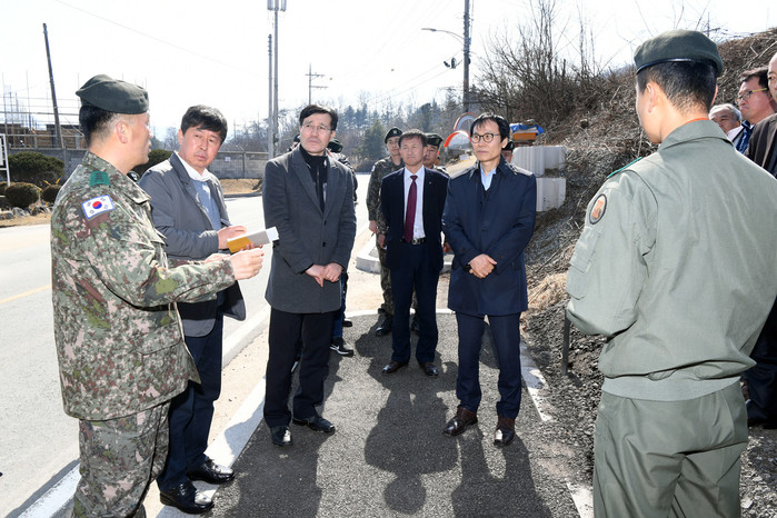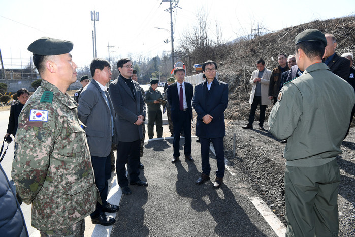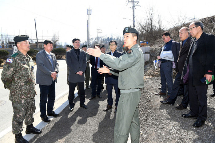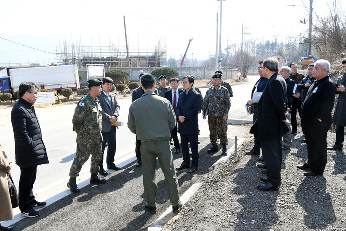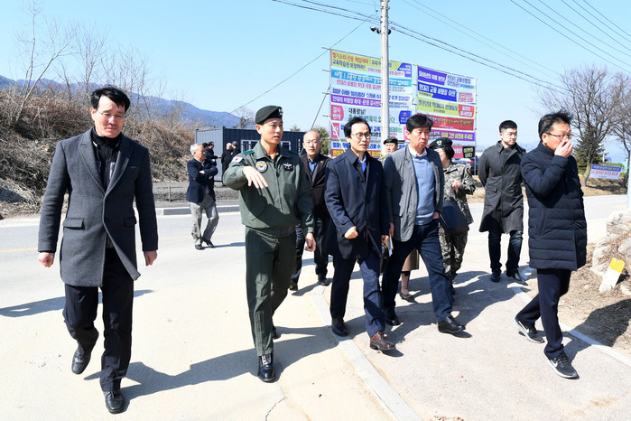 [양구군=세계타임즈 김민석 기자] 이상건 의장, 김철 의원, 김왕규 부군수, 김규호 도의원, 국민권익위원회 고충민원 방문조사단이 8일 안대리 헬기부대창설반대투쟁위원회 사무실 앞에서 군부대 관계자들의 설명을 듣고 있다.