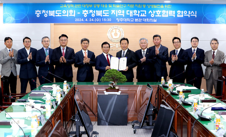 [충북 세계타임즈=이현진 기자] 충북도의회(의장 황영호)는 24일 청주대학교 대회의실에서 도내 17개 대학과 지역대학 발전을 위한 상호협력 협약을 체결했다.