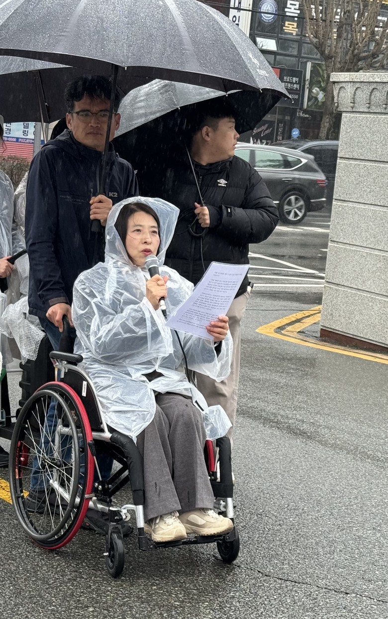 | ▲ 김미경 전남도의원이 2월 20일, 목포시청 앞에서 열린 ‘목포 장애인 시민 한국전력 변압기 충돌사고 장애인차별구제 공익소송 제기’ 기자회견에 참석해 연대발언을 하고 있다. |