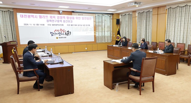 [대전 세계타임즈=이채봉 기자] 대전시의회 「대전 체육 발전을 위한 연구회」(회장 민경배 의원)는 19일 대전시의회 소통실에서 ‘대전광역시 엘리트 체육 경쟁력 향상을 위한 발전 방안’ 연구용역 중간보고회를 열었다.