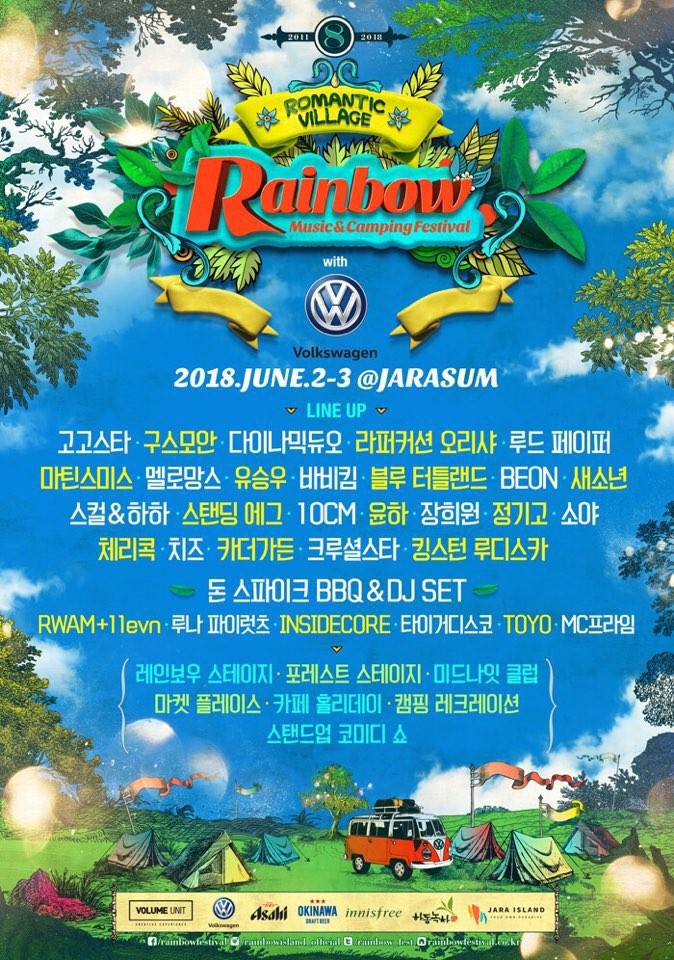 [세계타임즈 이영진 기자] 폭스바겐코리아는 오는 6월 2일부터 3일까지 이틀간 경기도 가평군 자라섬에서 개최되는 국내 최대 규모 뮤직 캠핑 페스티벌, ‘레인보우 뮤직 & 캠핑 페스티벌 2018’을 공식 후원한다.