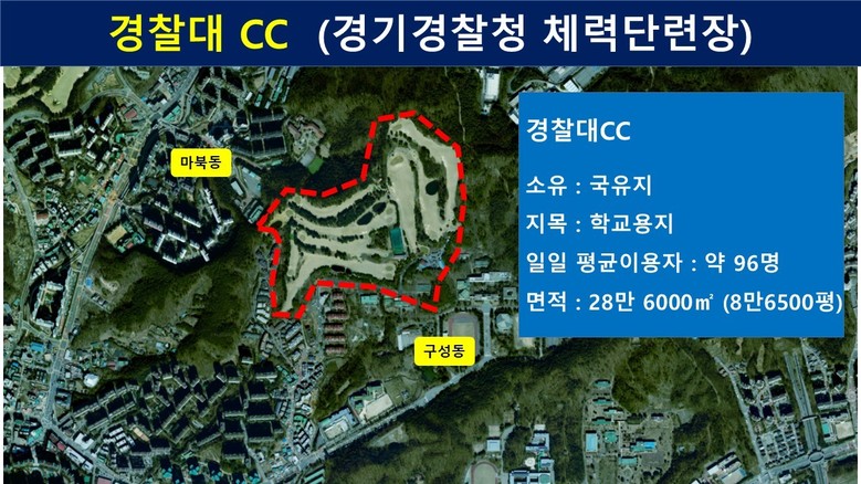 김 의원은 “현재 LH가 5400세대 규모의 주택사업을 추진하고 있으나, 학교용지에 남아있는 골프장으로 인해 구성동과 마북동이 단절돼 있다”며, “일일 평균 이용자도 약 96명에 불과한 만큼 해당 부지를 주택공급 확대와 함께 생활체육시설, 공공도서관 등 생활SOC 조성, 교통환경 개선을 위한 공간으로 활용해야 한다”고 주장했다.