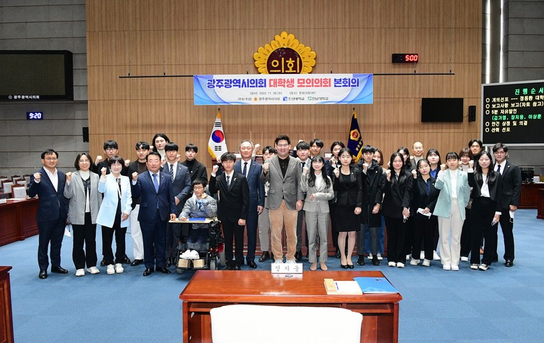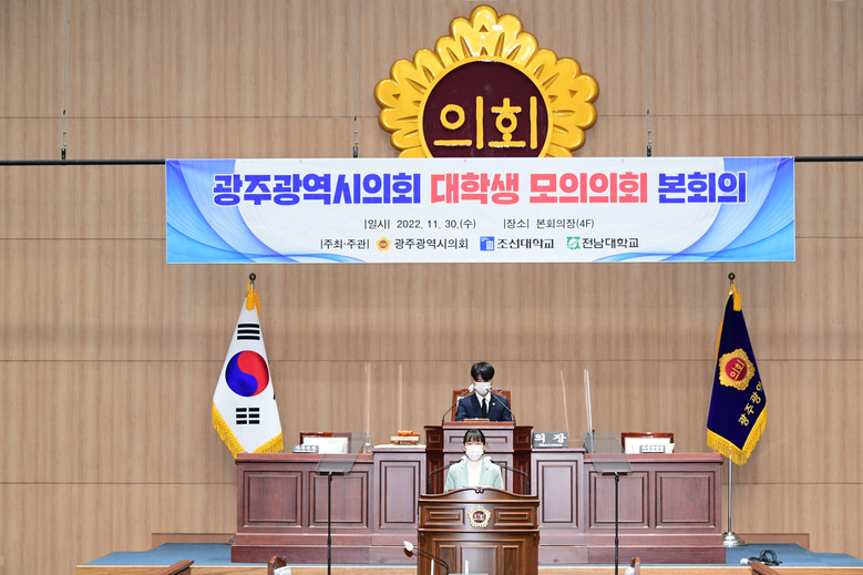 [광주 세계타임즈=손권일 기자] 광주광역시의회(의장 정무창)는 11월 30일(수), 시의회 본회의장에서 조선대학교·전남대학교와 공동으로 ‘2022년 대학생 모의의회 본회의’를 개최했다고 밝혔다.