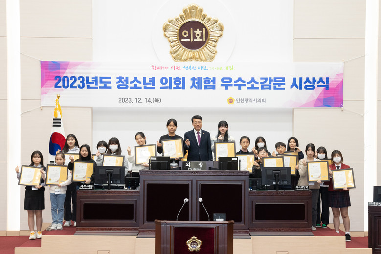 [인천 세계타임즈=심하린 기자] 인천광역시의회(의장 허식)는 최근 의회 본회의장에서 ‘2023년도 청소년 의회체험 우수소감문 시상식’개최, 최우수자로 선정된 청소년 17명에게 상장을 수여했다고 15일 밝혔다.