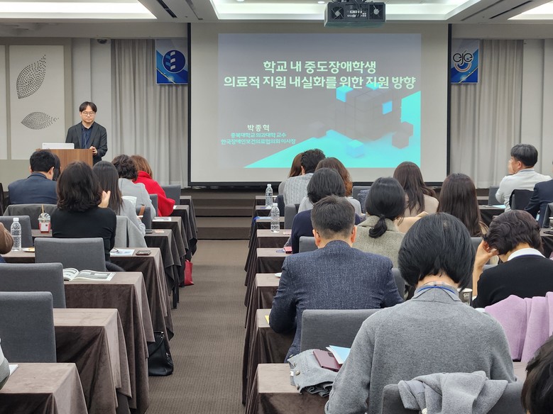 기조강연에서는 박종혁 충북대학교 교수가 학교 내 의료적 지원이 필요한 중도장애학생에 대한 지원 방향과 전문성 강화를 위한 실천 전략을 제시했다.