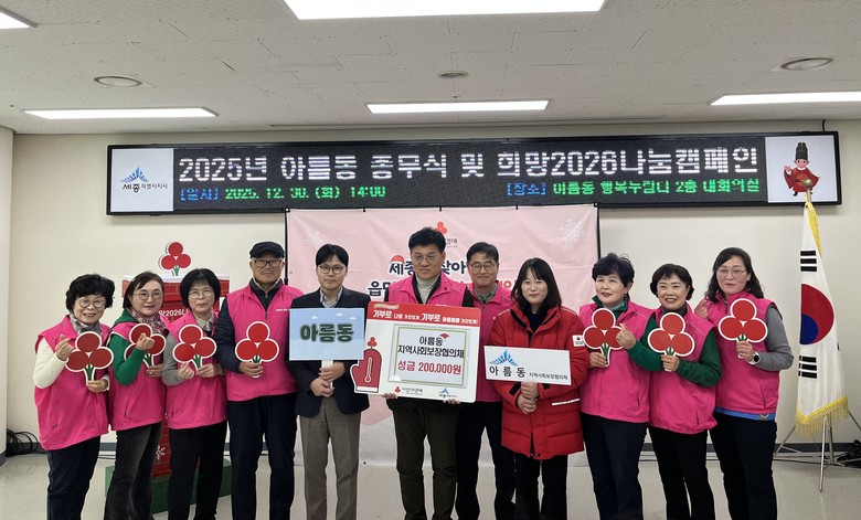 [세종 세계타임즈=이채봉 기자] 세종특별자치시 아름동지역사회보장협의체(공동위원장 이인환·조형관)가 30일 아름동 행복누림터(복합커뮤니티센터) 대회의실에서 연말을 맞아 ‘희망2026나눔캠페인’ 순회모금 활동을 진행했다.