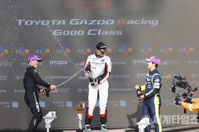 슈퍼레이스 9라운드 결승 후, 포디움에서 샴페인 세리머니를