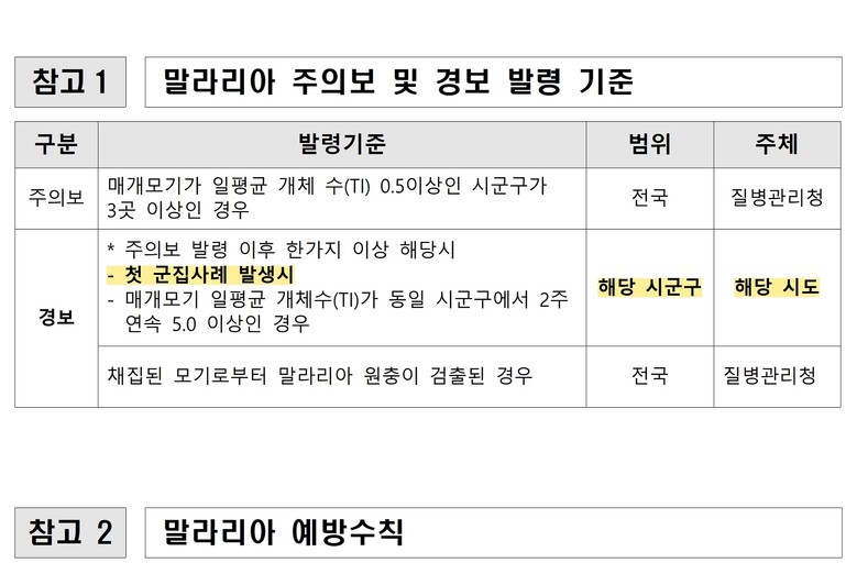 말라리아 경보는 전국 말라리아 주의보 발령 이후 첫 군집사례가 발생하거나 동일 시군구에서 매개모기 일 평균 개체수가 2주 연속 5.0 이상일 때 내려진다.