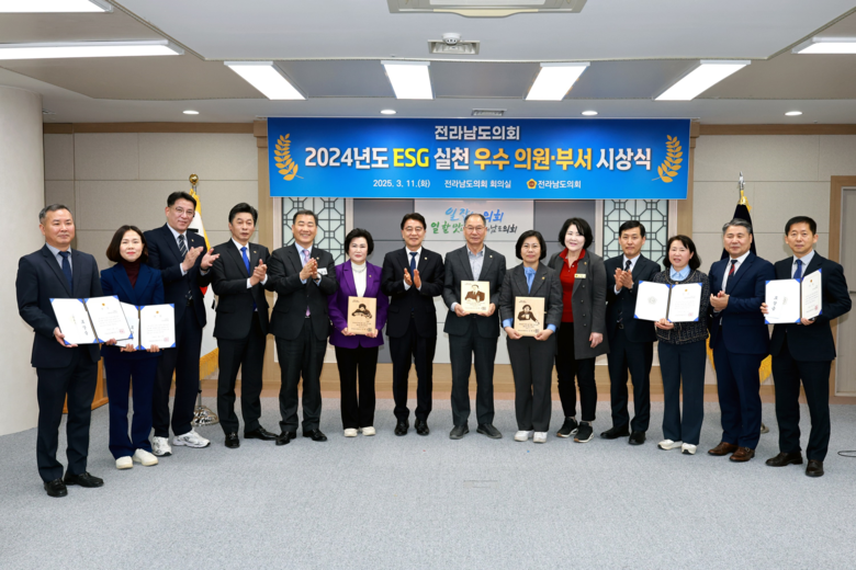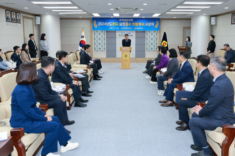 [전남 세계타임즈=우덕현 기자] 전라남도의회(의장 김태균)는 3월 11일 도의회 4층 회의실에서 2024년도 ESG 실천 우수 의원·부서 시상식을 개최하였다.