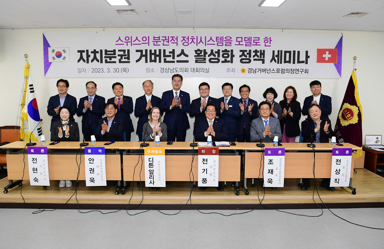 [경남 세계타임즈=최성룡 기자] 경상남도의회 의원 연구단체인 ‘경남거버넌스포럼의정연구회’(회장 전기풍 의원)은 3월 30일 경상남도의회에서 ‘스위스의 분권적 정치시스템을 모델로 한 자치분권 거버넌스 활성화’ 방안에 대한 정책세미나를 개최했다.