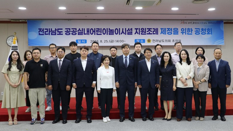 이번 공청회는 놀이공간이 부족한 전라남도에 실내 어린이 놀이시설을 조성해 아동의 놀 권리 보장 및 건전한 성장을 위해 조례를 제정하고자 마련됐고 전남연구원 심미경 박사, 세한대학교 유아교육과 조숙영 교수, 영광군 학부모, 전라남도 인구청년정책관실 인구정책팀장, 전라남도 여성가족정책관 등이 참석했다.