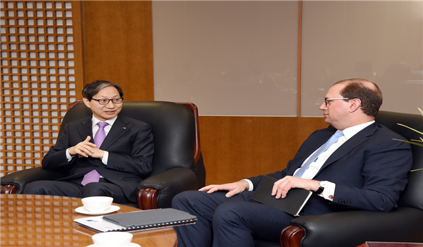사진설명:3.27(수) 오전 국민연금공단 김성주 이사장(왼쪽)과 블랙록자산운용 마크 와이즈먼 부회장(오른쪽)이 공단 이사장 집무실에서 환담을 나누고 있다.