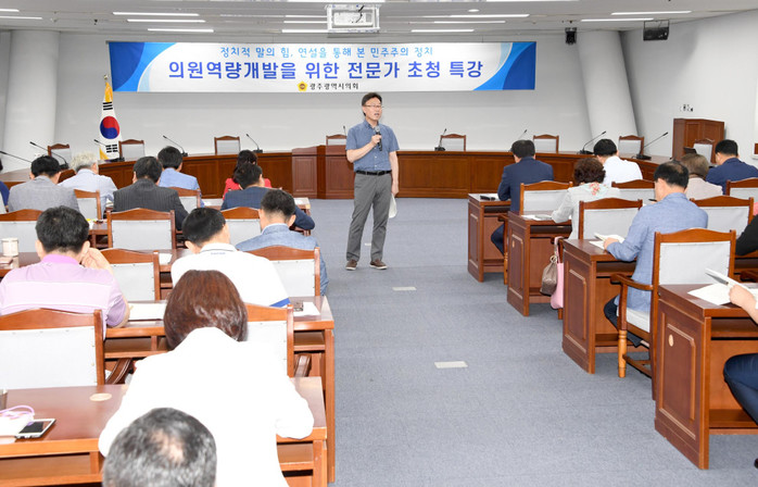 [광주=세계타임즈 손권일 기자] 광주광역시의회(의장 김동찬)는 7월8일 오전9시30분 시의회 5층 예산결산특별위원회의실에서 광주시의원과 각 구 의원들이 참석한 가운데 박상원 국회미래연구원을 초청해 특강을 진행했다