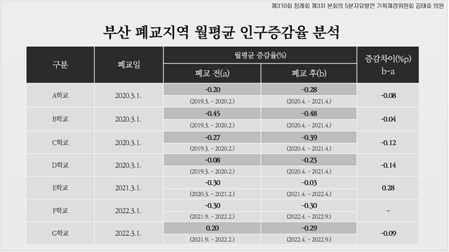 그리고 2020년 이후 폐교된 학교 중 비교 가능 수치가 있는 7개 학교에 대해 해당 지역의 폐교 전.후 월평균 인구 증감율을 분석한 결과, 폐교 전보다 폐교 후 인구 감소율이 더욱 증가하는 것을 확인했다. 이는 결국 학교와 지역사회 소멸은 악순환되고 있는 것을 나타낸다며 학교가 사라지고 학생 수가 감소하여 공교육의 현실이 악화되는 현실에 우려를 표했다.
