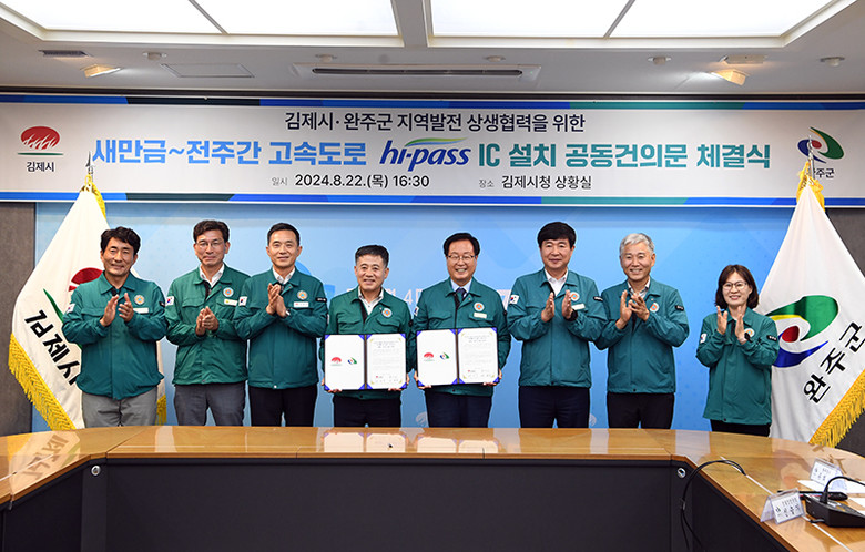 22일 유희태 완주군수와 정성주 김제시장은 김제시청 상황실에서 새만금~전주간 고속도로 하이패스IC 설치 사업을 촉구하는 공동건의문에 서명하고 협력 의지를 다졌다.