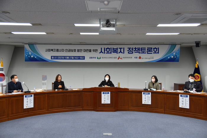 한편 이번 ‘사회복지종사자 인권 보호 방안 마련을 위한 정책토론회’에는 이선미 연구위원(광주복지연구원)와 김용민 교수(송원대학교 사회복지학과)가 발제를 하였고, 토론자로 김용목 대표((사)실로암사람들), 박일연 교수(호남신학대학교 사회복지상담학과), 박병훈 대표(톡톡브레인심리발달연구소), 이정훈 센터장(서울 감정노동 종사자 권리보호센터)이 참여하였다. 이번 ‘사회복지종사자 인권보호 방안 마련을 위한 정책토론회’는 『광주광역시의회 유튜브채널』을 통해 다시 시청할 수 있다.