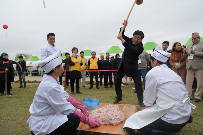 관람객들이 딸기 떡메치기 체험을 하고 있다.