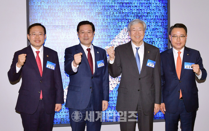 | ▲이용섭 광주광역시장이 19일 오후 서구 김대중 컨벤션센터에서 열린 '광주은행 창립 50주년 전야제 및 100년 은행 선포식'에 참석해 기념촬영을 하고 있다. 왼쪽부터 김동찬 광주시의회의장, 이용섭 광주시장, 김한 JB금융지주 회장, 송종욱 광주은행장 |