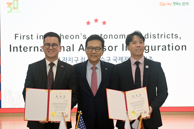 [연수구 세계타임즈=심하린 기자] 연수구(구청장 이재호)는 지난 16일 연수구 국제자문관으로 맷 홀튼(코튼우드 하이츠시의원)과 제임스 박(유타대학교 아시아캠퍼스 대외협력처 실장)을 위촉했다.