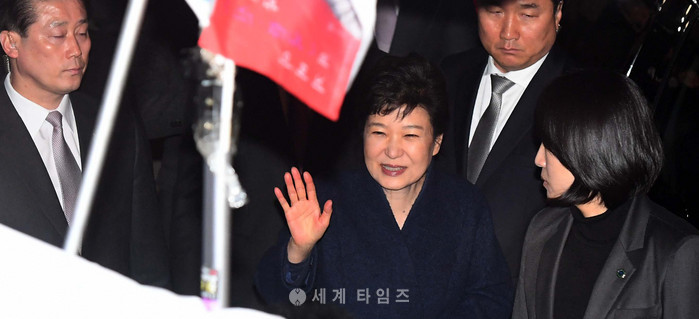 박근혜 전 대통령이 12일 서울 강남구 삼성동 사저로 들어서며 지지자들과 인사를 나누고 있다. 2017.03.12.