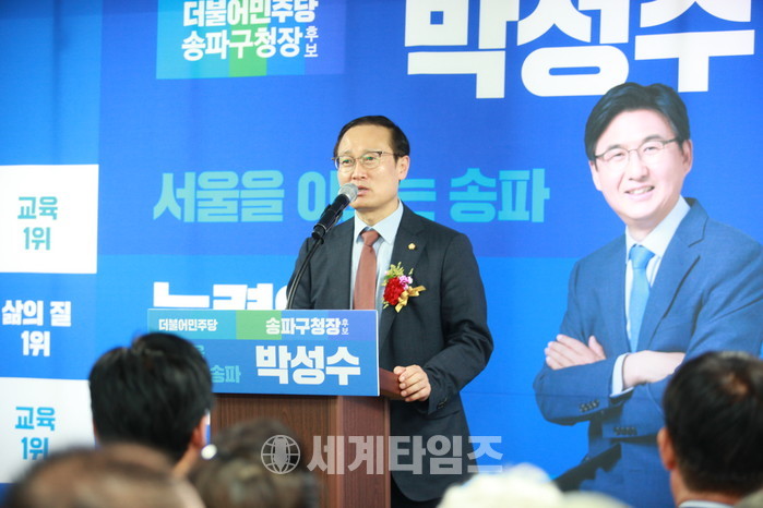 더불어민주당 홍영표 원내대표가 박성수 송파구청장 예비후보 개소식 인사말을 하고있다.사진=이연종 기자