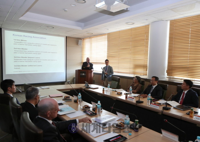 [세계타임즈 신민정 기자]8일(금) 한국마사회가 해외 심판 수석과 수의 수석을 초청해 컨퍼런스를 개최했다. 경마의 공정성을 책임지는 심판과 수의 분야 합동 컨퍼런스 개최로 한국경마 시행의 선진화를 이끌어내겠다는 취지다. 홍콩자키클럽(HKJC)에서 킴 켈리(Kim kelly) 심판 수석과 브라이언 스튜어트(Brian Stewart) 수의 수석이, 일본 JRA에서 요키노부 쇼무라(Yukinobu Shomura) 심판위원이 참석했다.