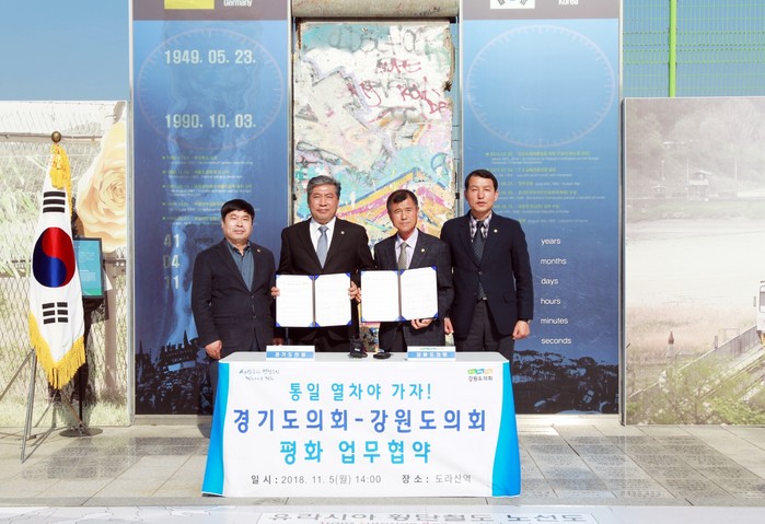 [강원도=세계타임즈 김민석 기자] 강원도의회(의장 한금석)는 경기도의회와 남북교류사업 협력 및 DMZ 공동개발을 위하여 11월 5일 오후 2시에 도라산역(경기도 파주)에서 ‘평화 업무협약’을 체결하였다.