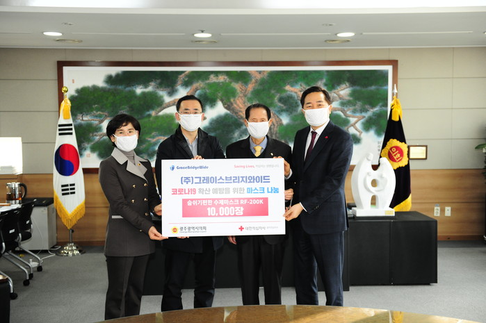 이 날 기탁식은 ㈜그레이스브리지와이드가 코로나19 사태의 장기화로 많은 어려움을 겪고 있는 노인과 장애인, 임산부와 아동 등을 감염증 위기로부터 보호하기 위해 자사에서 제작한 숨쉬기가 편안하고 착용감이 우수한 고급마스크 1만장(육천만원 상당)을 대한적십자사광주전남지사회에 기부하고자 마련됐다.